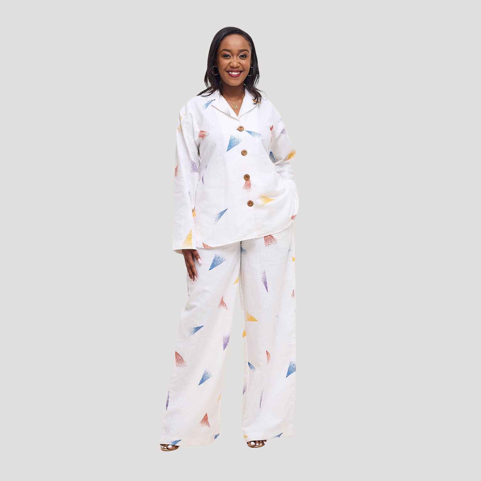 Experience ultimate comfort and artistic flair with this pure linen lounge set, adorned with vibrant, hand-printed geometric motifs. Perfect for relaxed days or stylish evenings at home.