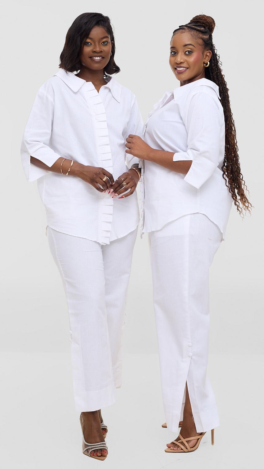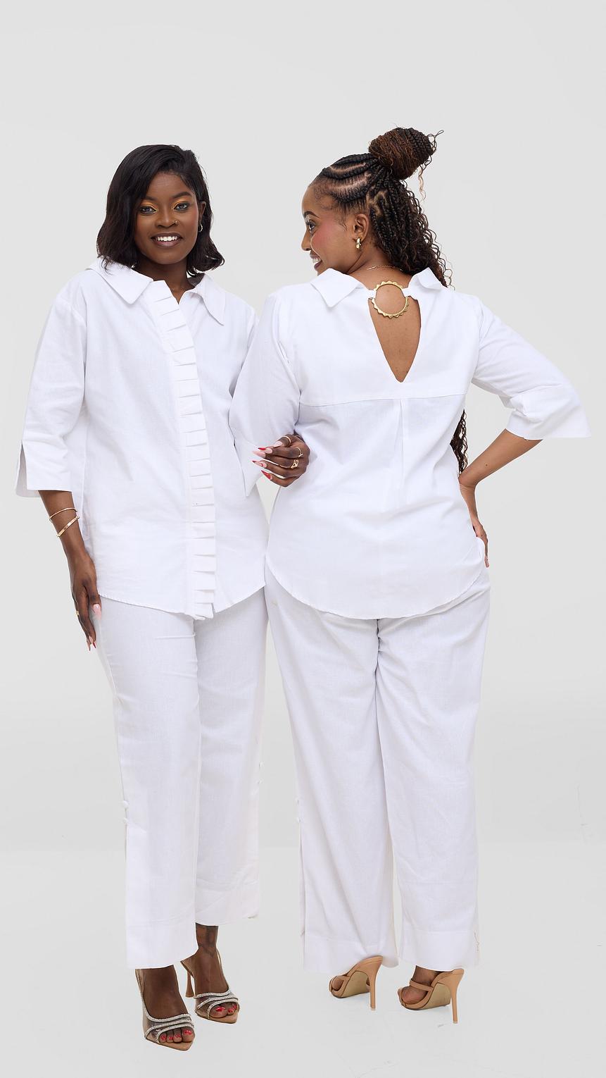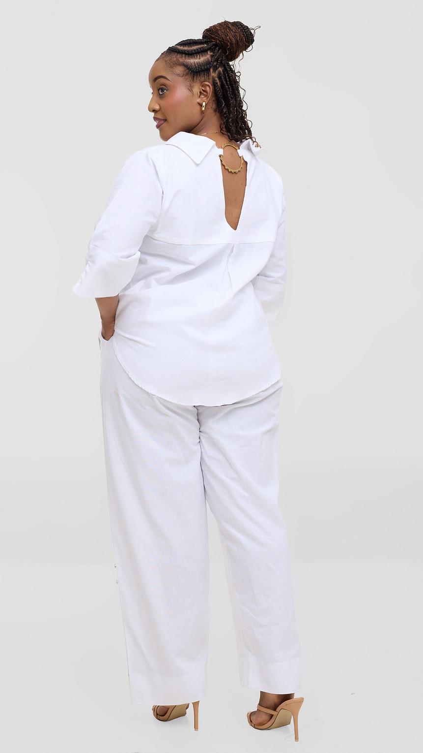 A relaxed-fit button-down top with a classic collar and three-quarter sleeves, A unique open-back design finished with a striking brass detail adds a subtle statement from behind.
