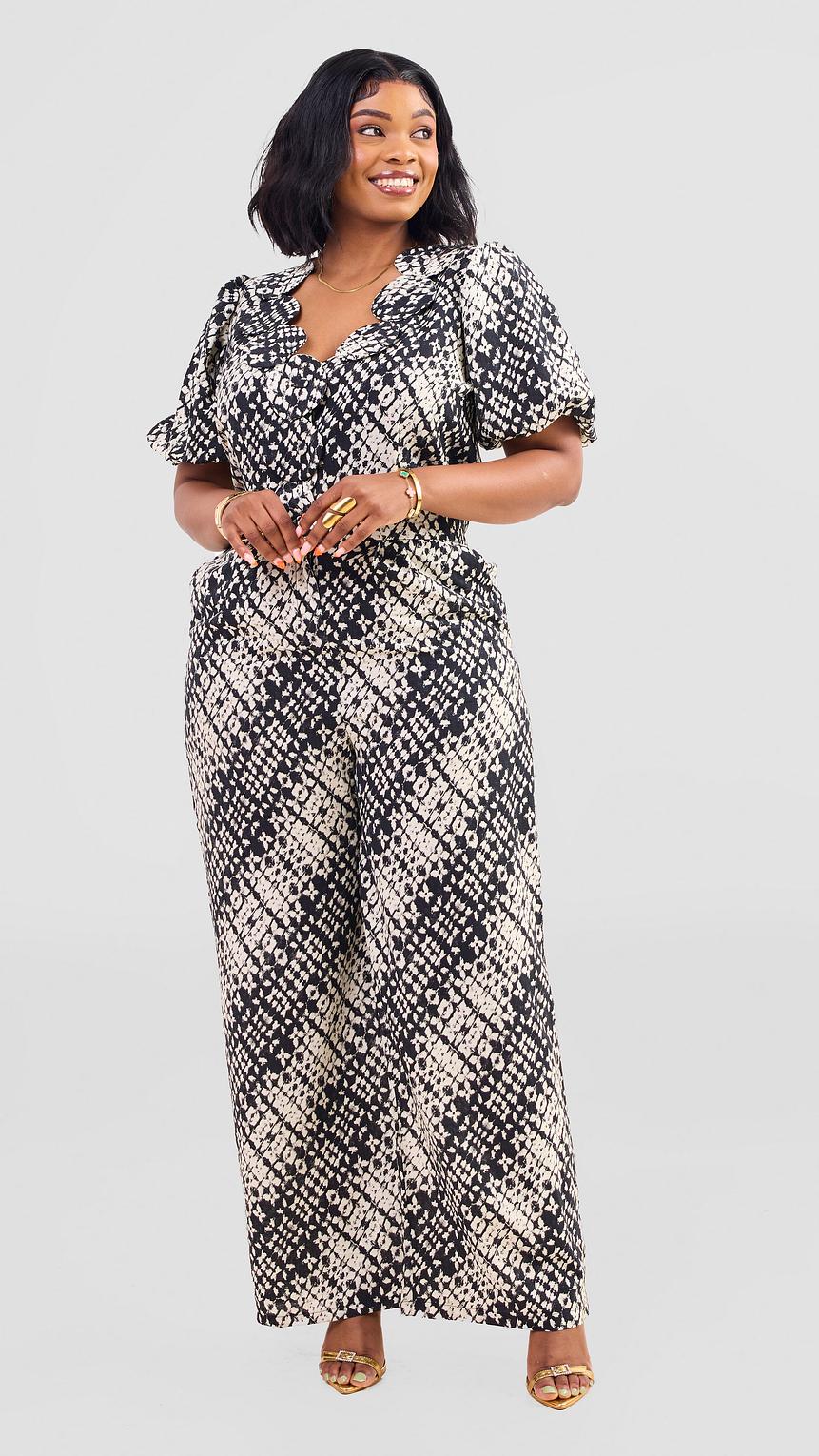 Turn heads in this Black Printed Linen Jumpsuit. Designed to flatter every curve while keeping you effortlessly stylish. Made from soft, breathable fabric, it features a defined belted waist that enhances your silhouette, short sleeves for easy movement and straight-leg pants that create a sleek, elongated look.
