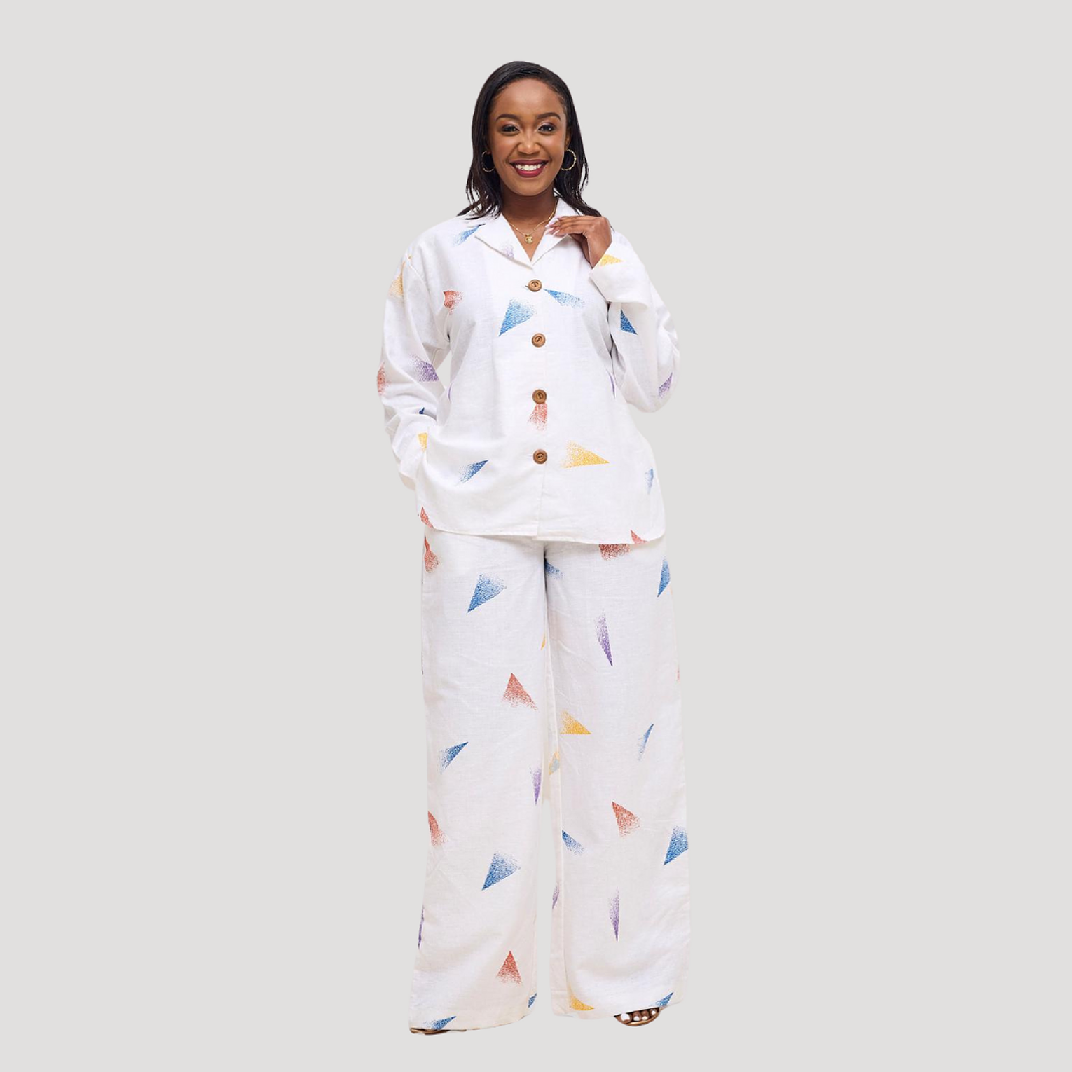 Experience ultimate comfort and artistic flair with this pure linen lounge set, adorned with vibrant, hand-printed geometric motifs. Perfect for relaxed days or stylish evenings at home.