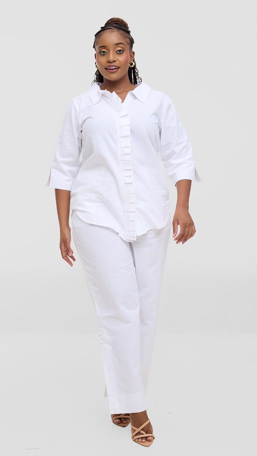 A relaxed-fit button-down top with a classic collar and three-quarter sleeves, A unique open-back design finished with a striking brass detail adds a subtle statement from behind.
