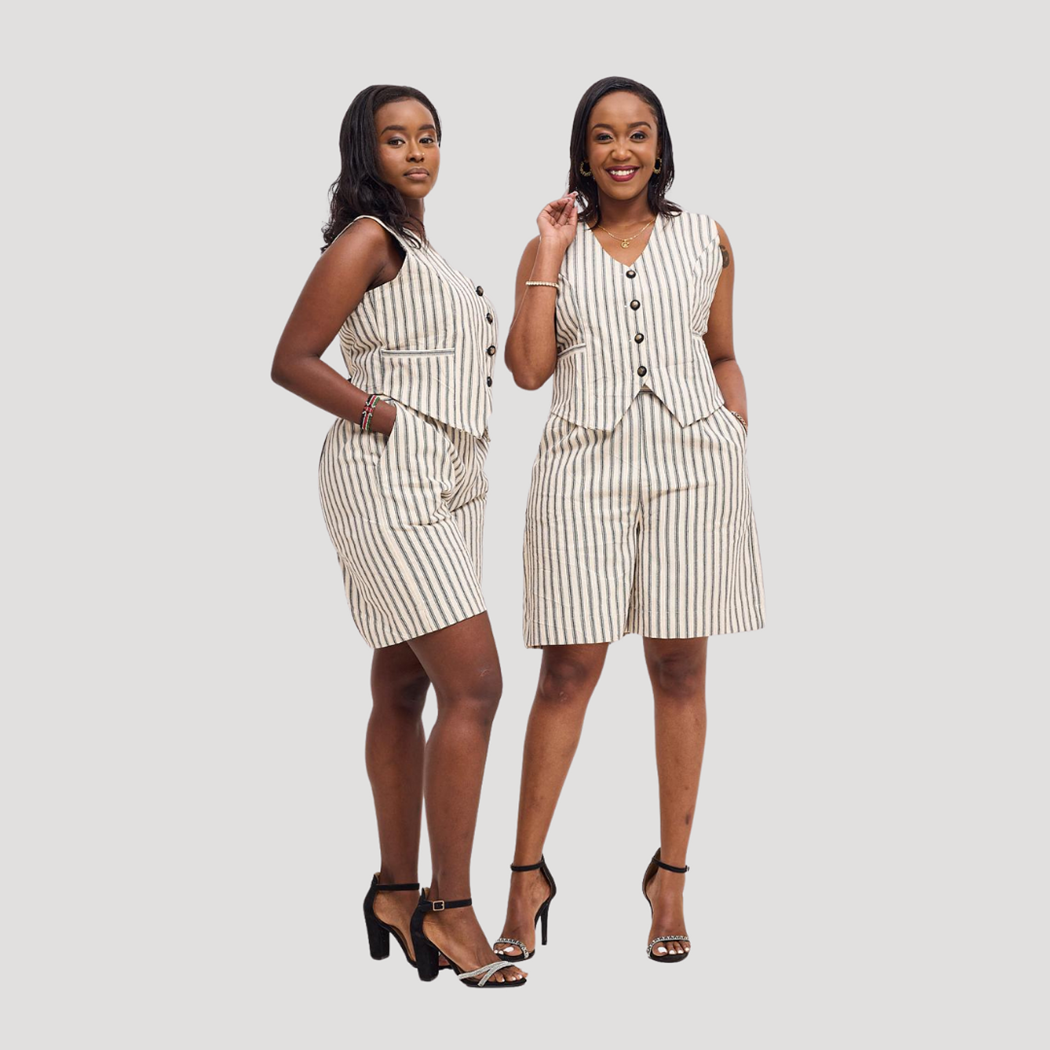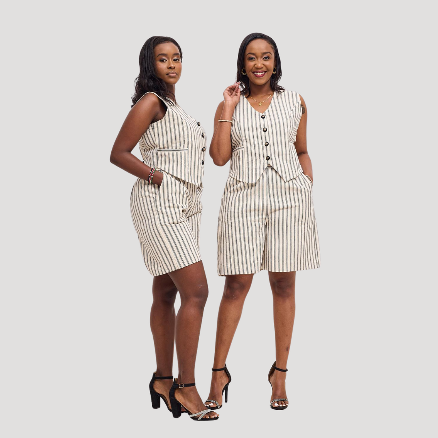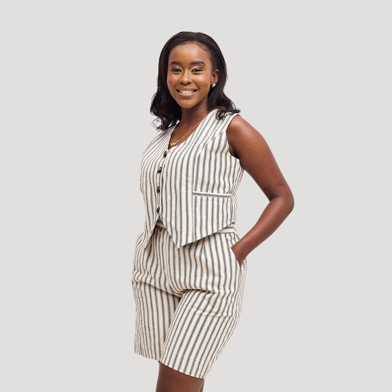 The Bold black and cream High waisted tailored short set that gives a flattering silhouette paired with a structured half jacket cropped just right to accentuate your waistline with a functional front pockets just for style